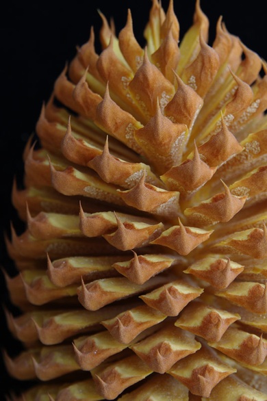 Šupiny samčí šištice cykasu bezzubého z horní a dolní strany. Tyto fotografie slouží k jednoznačnému odlišení druhu od podobných či často zaměňovaných druhů Cycas rumphii nebo circinalis (Foto: Miloslav Studnička, BZ Liberec). Všimněte si otevřených drobných pylových váčků na spodní straně a vysypaného pylu.